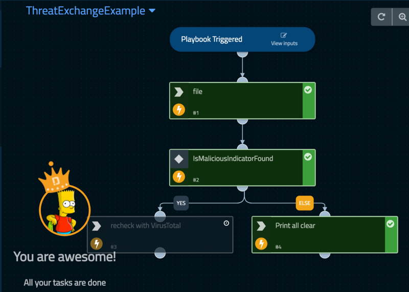 Вот так выглядит простейший Playbook когда вы сравниваете свой файл с базой Threat Intelligence например из Facebook и затем со следующей базой, например, с VirusTotal и так далее.
