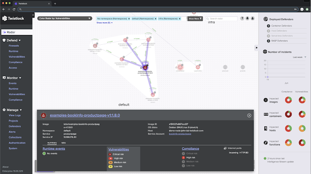 Например, продукт компании https://www.twistlock.com/ позволяет визуализировать контейнеры, показать уязвимости, защитить контейнеры во время их работы, создать внутреннюю сегментацию в рамках одного хоста с контейнерами.