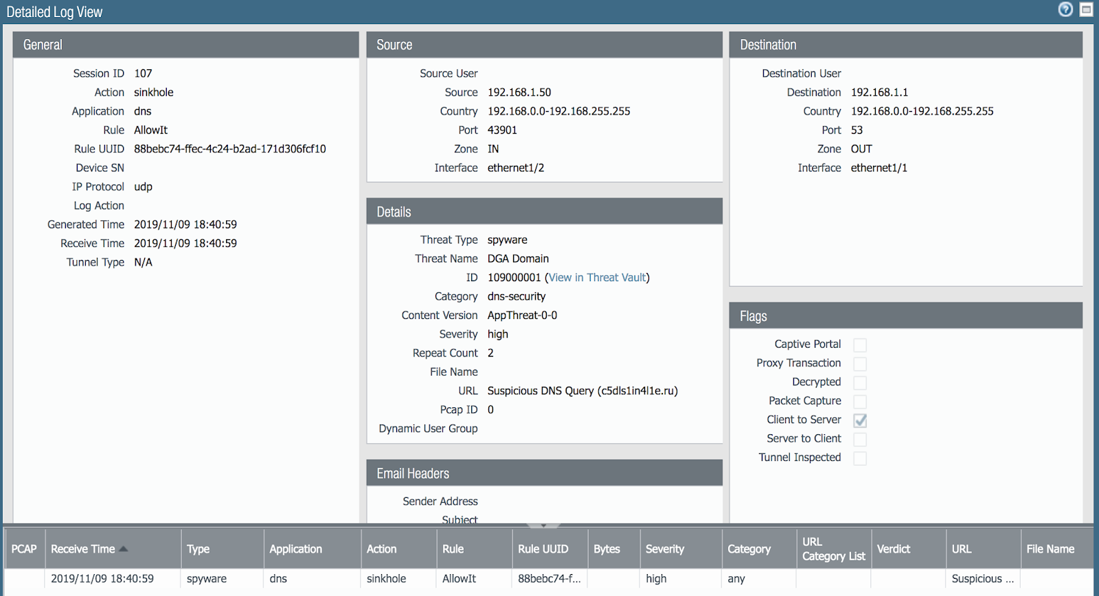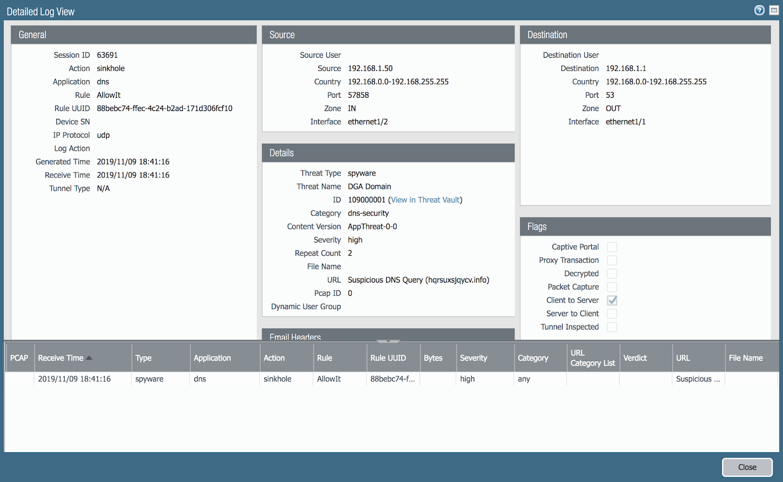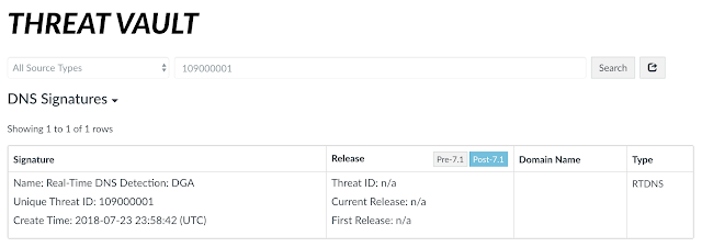 Однако он известен DGA детектору с 2018 года и до сих пор используется, как это видно в базе угроз Threat Vault и в журнале NGFW