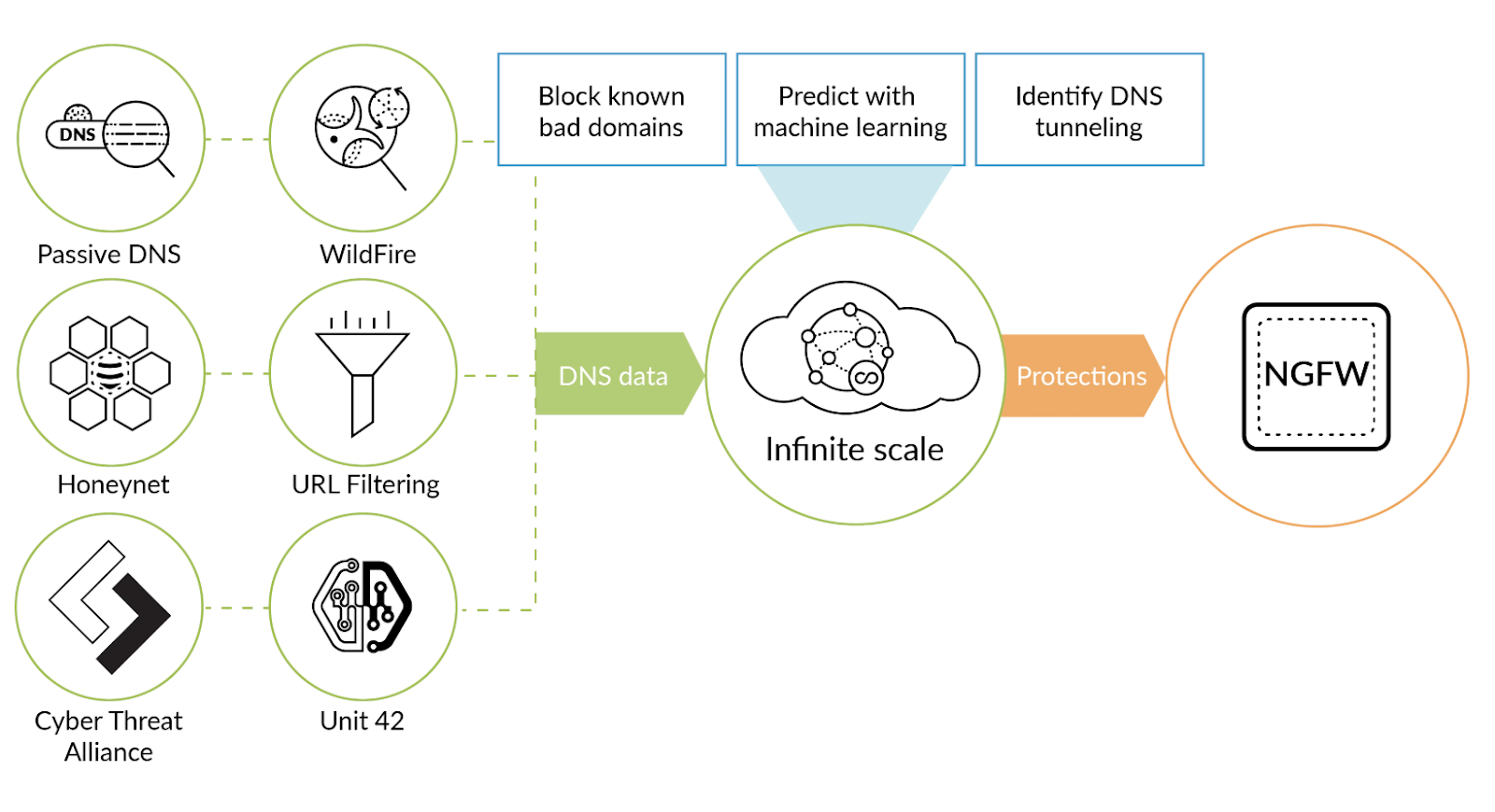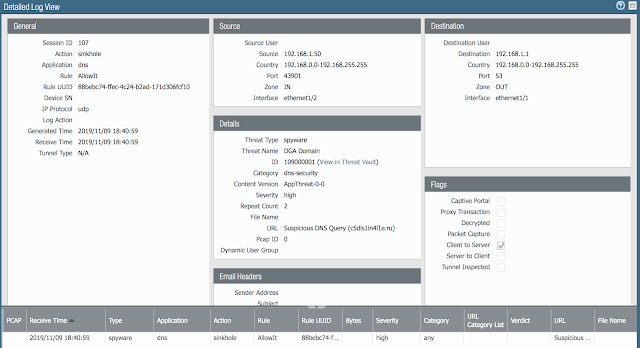 В Palo Alto Networks NGFW существует защита DNS, которая распознает автоматически домены, которые не может сгенерировать человек. Основой этой защиты является Machine Learning, который распознает эти алгоритмы генерации имен доменов. Функционал защиты DNS в NGFW включает функцию DNS Sinkholing для подмены обращений к найденным вредоносным доменам. Также осуществляется блокировка туннелей по DNS. Также источником информации о вредоносных DNS адресах является песочница Wildfire, пассивные сенсоры DNS по всему миру, специализированные HoneyPot, лаборатория исследователей Unit42 и информация получаемая в рамках сотрудничества между всеми компаниями по кибербезопасности входящими в Cyber Threat Alliance. Все готовые результаты приходят с обновлениями в NGFW и благополучно блокируются как это видно на картинке выше.