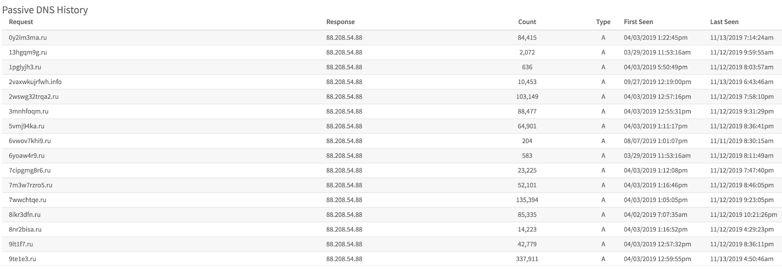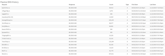 Сейчас вредоносный код генерирует специальные строки с именами доменов и подключается по нужному ему имени DNS в нужный ему момент времени. Этот алгоритм называется Domain Generation Algorithm ( DGA). Центр управления бот-сетью теперь не находится по одному доменному имени, а постоянно "переезжает". Например на картинке ниже видно, как было подключение по адресу hqrsuxsjqycv.info. Это какой-то придуманный домен (явно не человеком).