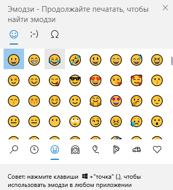 - Нажмите Win+. (точка) или Win+; — откроется панель.