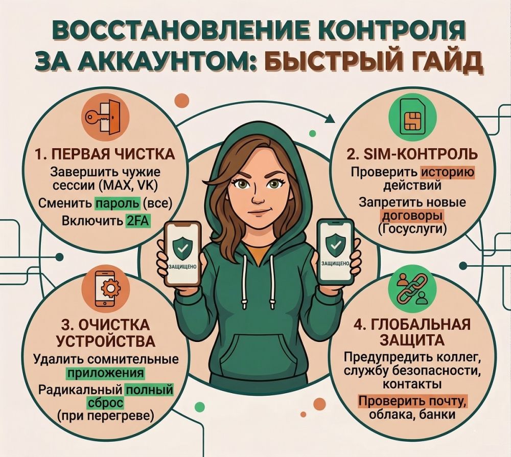 Если переписка связана с работой или деньгами — действуйте шире. Предупредите коллег, проверьте почту, облачные сервисы, банковские приложения, все, где использовался тот же номер или похожий пароль. После взлома мессенджера проблема редко остается в одной точке.