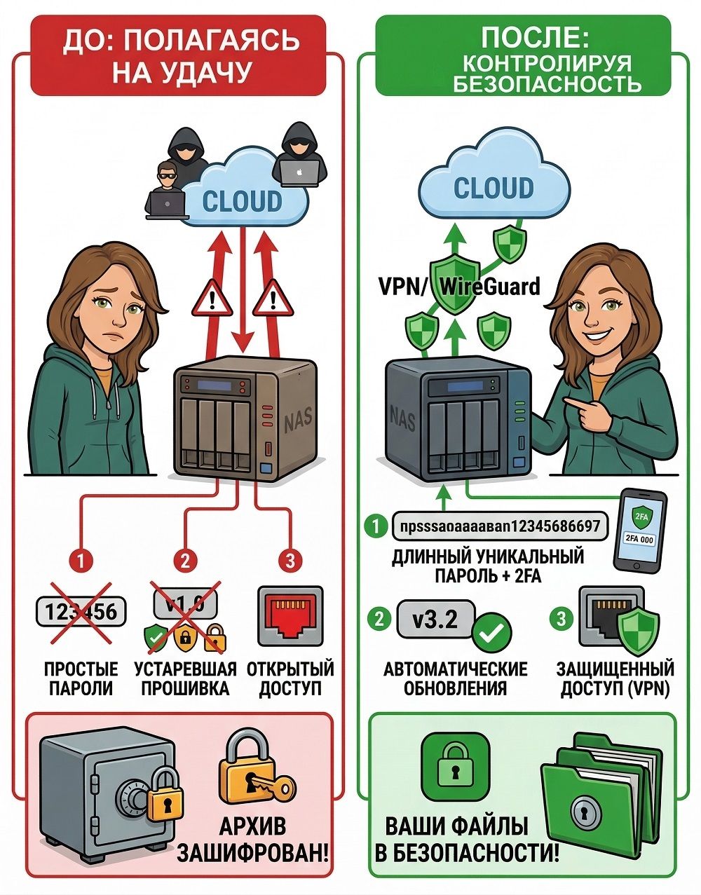 Такой набор не превращает домашнюю технику в неприступную крепость, но резко снижает шансы увидеть на экране требование перевести деньги ради доступа к семейным фотографиям. Для домашнего NAS такой результат уже очень хорош. Несколько спокойных настроек сегодня почти всегда полезнее, чем героическое восстановление архива завтра.