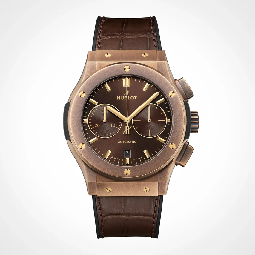 Hublot Classic Fusion Chronograph Bronze Brown — тот самый «Fusion» в массивной бронзе и би-компаксе, где винты на безеле — часть образа. Официальная страница: Classic Fusion Chronograph Bronze Brown.