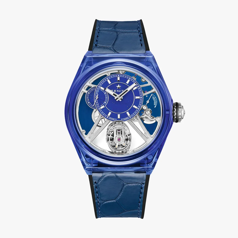 Zenith Defy Zero G Sapphire — гравитационный модуль в полностью сапфировом корпусе; визуальный вау-эффект обеспечен. Официальная страница: DEFY Zero G Sapphire.
