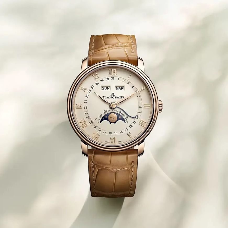 Blancpain Villeret Quantième Complet (Golden Hour) — классический «полный календарь» с лунными фазами в обновлённой палитре и деталях набора. Официальная страница: Villeret Quantième Complet.