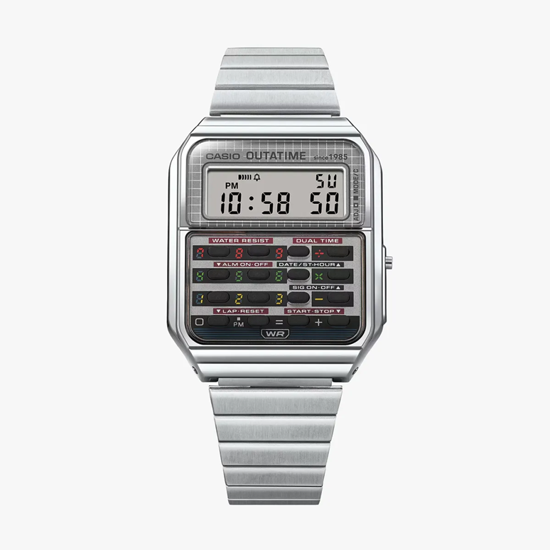 Back to the Future × Casio Vintage CA-500WEBF-1A — юбилейный «калькулятор» с эстетикой DeLorean и пасхалками для фанатов фильма. Официальная страница: Casio CA-500WEBF-1A.