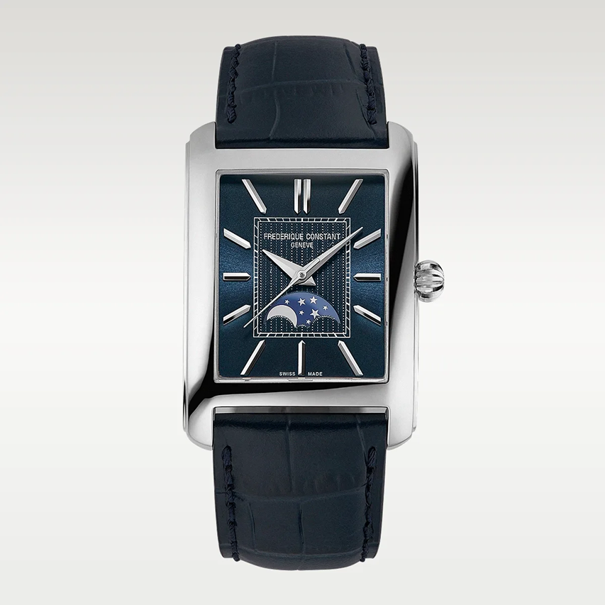 Frederique Constant Carrée Moonphase Automatic — прямоугольная «каре» теперь с фазами Луны и обновлёнными пропорциями корпуса. Официальная страница: Carrée Moonphase Automatic.