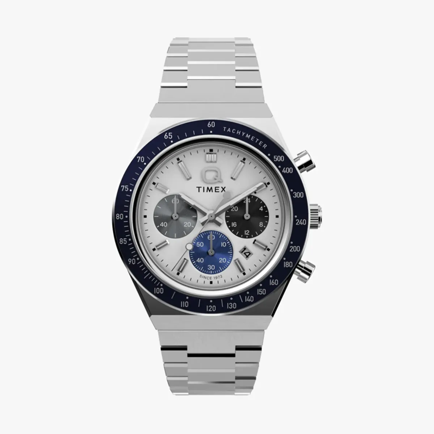 Q Timex Chronograph (Stainless Steel) — узнаваемый трёхсубдальный «ретро-гоночник» на стальном браслете. Официальная страница: Q Timex Chronograph (SS) или вся линейка.
