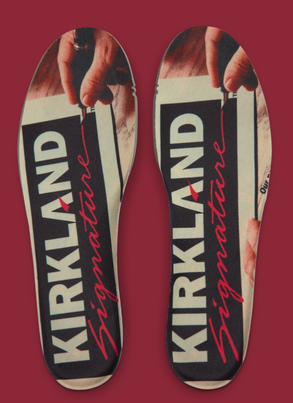 На внешних пяточных петлях — Kirkland Signature; на язычке — та же характерная графика. Стельки оформлены в фирменной эстетике Kirkland, а на шнурках висит бирка-жетон, стилизованная под карту участника клуба. Набор деталей не перегружает силуэт, но ясно даёт понять: это именно тот самый совместный выпуск, а не очередная «общая» расцветка.