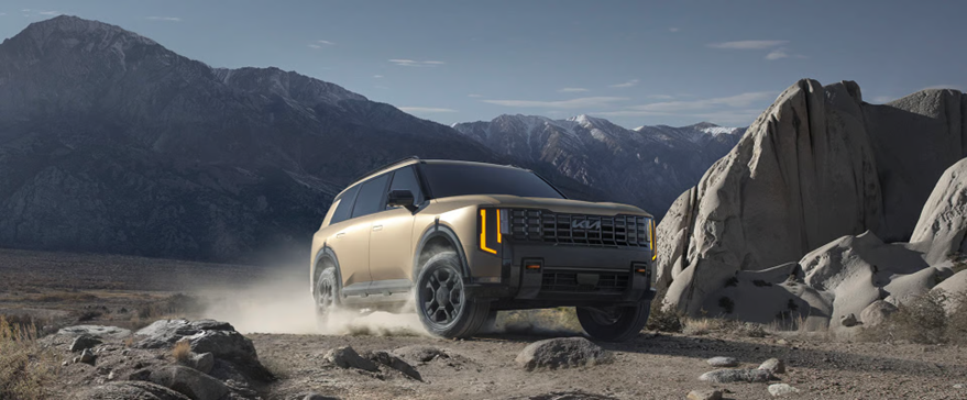 Telluride держится за традиционный двухобъёмный профиль, но выглядит собраннее и взрослее. Более квадратная фронтальная часть с вертикальными световыми блоками и спокойной решёткой добавляет уверенности, задние фонари сохраняют тонкий контур прежней оптики, а гладкие боковины без лишних штрихов делают образ чище. В этой сдержанности легко читается фирменная концепция Opposites United. По виду сбоку автомобиль действительно отсылает к премиальным полноразмерным моделям, и именно такая «сдержанная роскошь» формирует основной вайб новинки. Для ориентира по дизайнерскому языку можно вспомнить электрический Kia EV9 — у Telluride ощущается родство в графике и общей архитектуре, хотя характер остаётся собственным.