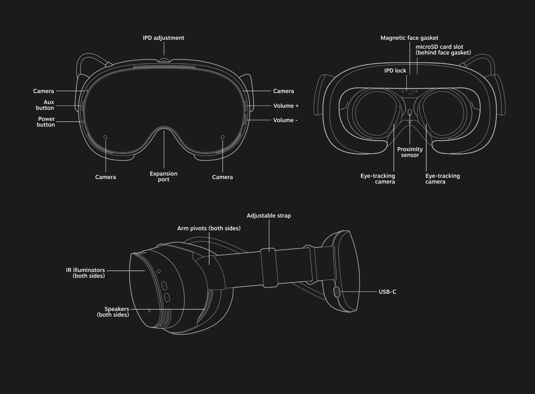 Отслеживание реализовано по схеме Inside-Out: за движение шлема и контроллеров отвечают четыре наружные монохромные камеры высокого разрешения. Они фиксируют изменения положения в пространстве и не требуют установки внешних базовых станций или маркеров в комнате. Дополнительно установлены две внутренние камеры, которые следят за движением глаз и обеспечивают работу фовеального рендеринга. Для сквозной передачи изображения внешнего мира предусмотрена отдельная монохромная камера, направленная наружу. Использование инфракрасных светодиодов позволяет поддерживать стабильное отслеживание и режим passthrough даже при слабом освещении или практически в темноте.