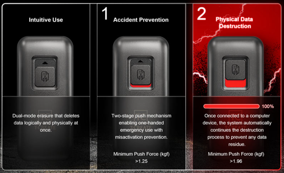 Когда всё заканчивается, диск становится полностью нефункциональным, а данные не подлежат восстановлению ни с помощью ПО, ни лабораторными техниками, потому что физическая структура памяти нарушена. По сути это одноразовый носитель: пока вы не нажали кнопку, он работает как нормальный внешний SSD. Как только процедура уничтожения запущена, история экземпляра на этом заканчивается.