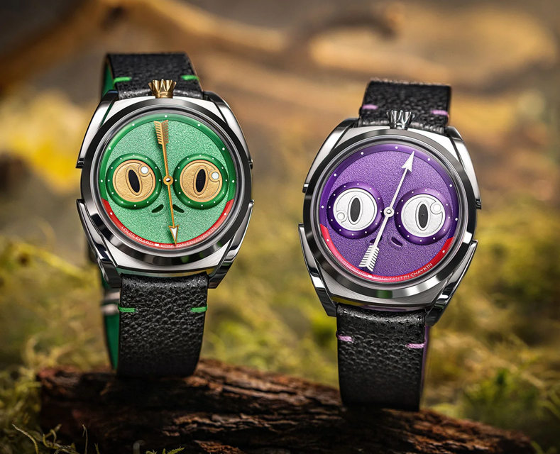 Идея и внешний облик здесь задаются не техническими характеристиками, а историей. Louis Erard взяли свою фирменную архитектуру регулятора и повернули её на 90 градусов, чтобы получить «лицо лягушки» с глазами по сторонам. Эти наручные часы отталкиваются от славянской сказки про Царевну-лягушку, а Чайкин опирается на собственную вселенную Wristmons с антропоморфными циферблатами, где стрелки и диски превращаются в глаза, рот и мимику.
