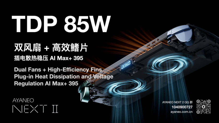 Чтобы рассеять до 85 Вт тепла в корпусе портативная консоль-размера, одной маленькой крыльчаткой уже не отделаться. AYANEO NEXT II использует двухвентиляторную систему с радиаторами и «высокоэффективными» рёбрами. Забор воздуха идёт сзади, выброс — вверх, то есть горячий поток должен уходить от рук и экрана, а не в ладони игрока. По словам производителя, конфигурация рассчитана именно на длительную работу под высокой нагрузкой, а не на «короткие спринты» с последующим троттлингом.
