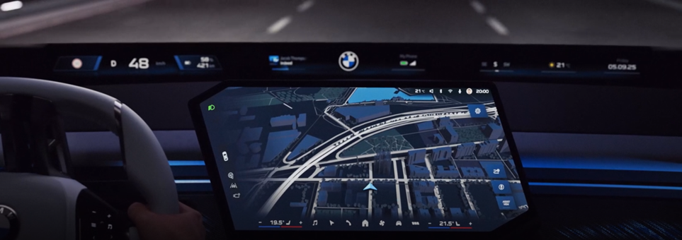 Внутри BMW iX3 уже не похож на привычный X3. Здесь нет классической «приборки» перед глазами — основные данные проецируются на широкую полосу в нижней части лобового стекла. Это новая концепция head-up дисплея, которая превращает стекло в крупный «экран».