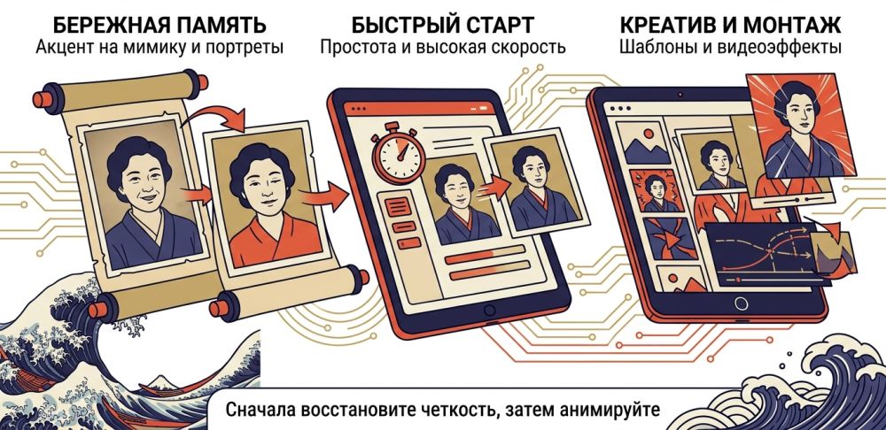 Кому подойдёт: тем, кто хочет бережно оживить старый портрет без лишних эффектов и без стилизации под развлекательный ролик.