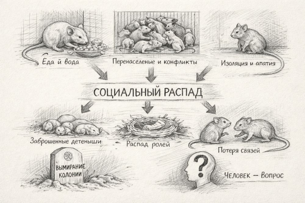 Я бы читал эксперимент не как пророчество о гибели человечества, а как предупреждение о цене плохо устроенной среды. Не всякое изобилие развращает. Не всякая плотность калечит. Не всякая безопасность усыпляет. Но система, где участники теряют роль, контроль, навыки заботы и понятные связи между действиями и последствиями, действительно начинает рассыпаться. Причем внешне такая система может выглядеть вполне благополучно.