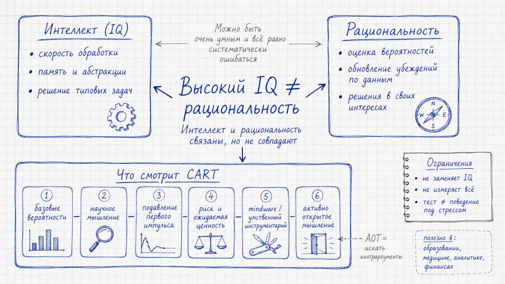 CART пытается собрать под одной крышей разные компоненты рациональности. Не только «реши логическую задачу», но и более неприятные для человека вещи: не поддался ли ты первому импульсу, умеешь ли учитывать базовые вероятности, замечаешь ли эффект формулировки, различаешь ли научное объяснение и псевдообъяснение, понимаешь ли ожидаемую ценность риска, не тащишь ли в голову «загрязненный» набор идей, который мешает мышлению вместо того, чтобы помогать.