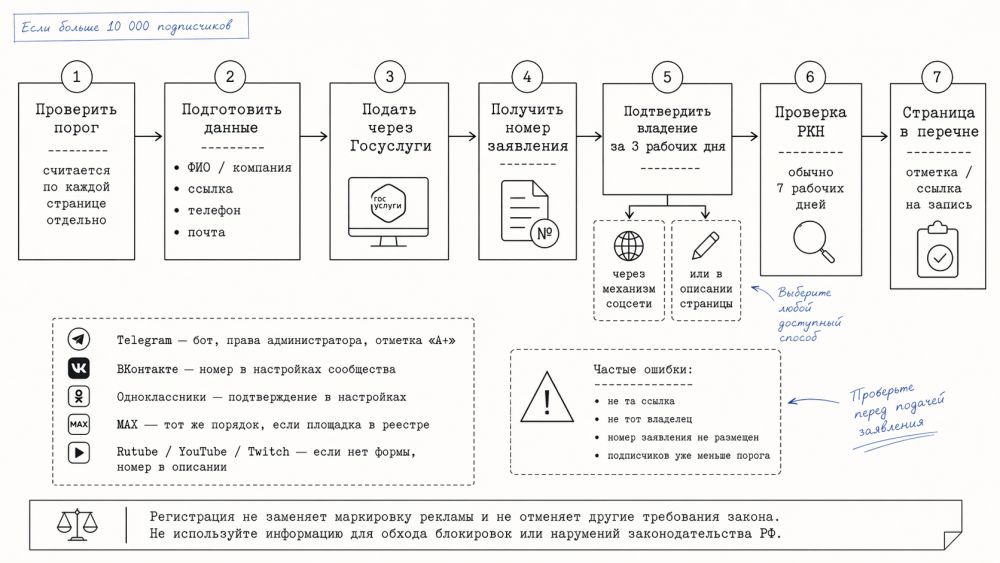 Главный практический смысл простой. Без регистрации крупная страница теряет нормальный рекламный оборот: рекламодателям нельзя размещать там рекламу, другим каналам нельзя спокойно репостить публикации, а РКН вправе требовать ограничения доступа к странице до исправления нарушения. Поэтому регистрацию лучше воспринимать не как декоративную галочку, а как обязательную техническую процедуру для публичной площадки с аудиторией больше 10 тысяч человек.