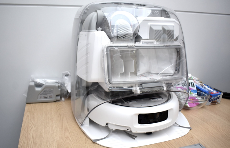 Коробка действительно крупная — сразу понимаешь, что покупаешь не просто пылесос, а целую систему. Внутри два главных героя: сам робот и массивная док-станция с функцией самоочистки. Первое, что бросается в глаза, — прозрачная крышка Romo. Видны все циклоны, фильтры и механизмы. Честно говоря, эффект «вау» срабатывает, особенно если показать гостям. Выглядит как что-то из лаборатории Apple.