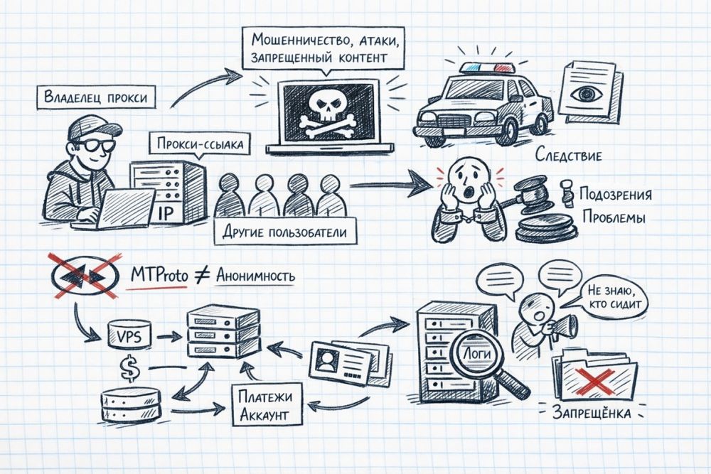 Представьте обычную цепочку. Вы подняли прокси «чисто для своих». Ссылка ушла дальше. Один из пользователей начал через Telegram крутить схему с обманом, давлением, рассылками или координацией незаконных действий. Потерпевшая сторона, сервис, хостер или правоохранители видят в сетевом следе ваш сервер. Дальше начинается не кино, а скучная и тяжелая реальность: запросы, заморозка, разбор переписок, объяснения, почему узел ваш, кто им пользовался и что вы знали.
