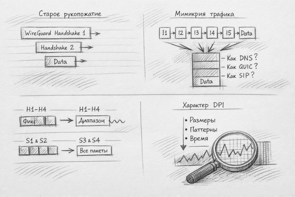 Базовый WireGuard быстрый и сравнительно простой, но узнаваемость долго была его слабым местом. Ранний AmneziaWG решал проблему через подмену статичных параметров, мусорные пакеты перед рукопожатием и padding для handshake-пакетов. Такой подход мешал простому сигнатурному DPI, но оставлял слишком много повторяемых признаков: фиксированные заголовки, предсказуемые размеры обычных data-пакетов и характерный рисунок начала сессии.