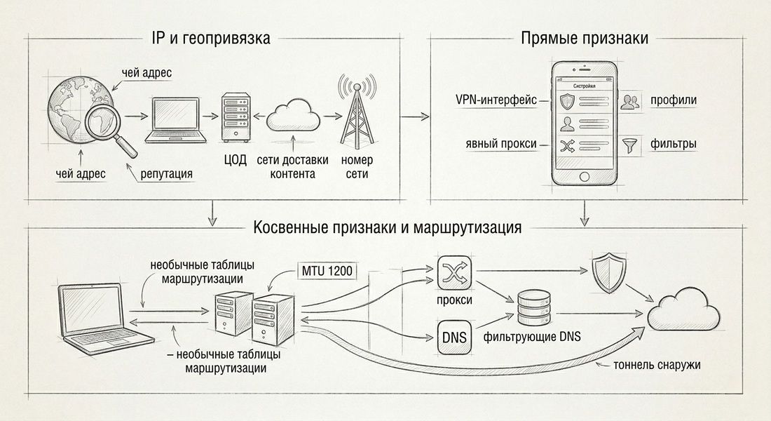 Клиентская часть методики его не видит: телефон или ноутбук не показывает никаких системных флагов VPN. Остаётся только серверная GeoIP-проверка, которая срабатывает, если IP выхода входит в репутационные списки.