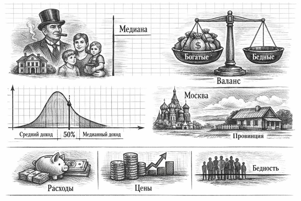 Именно поэтому медиану нельзя читать в одиночку. В нормальном анализе рядом должны стоять хотя бы еще несколько показателей: децильные или квинтильные группы, уровень бедности, реальные располагаемые доходы, медианные расходы на жилье, инфляция по базовой корзине, региональная разбивка и коэффициенты неравенства.