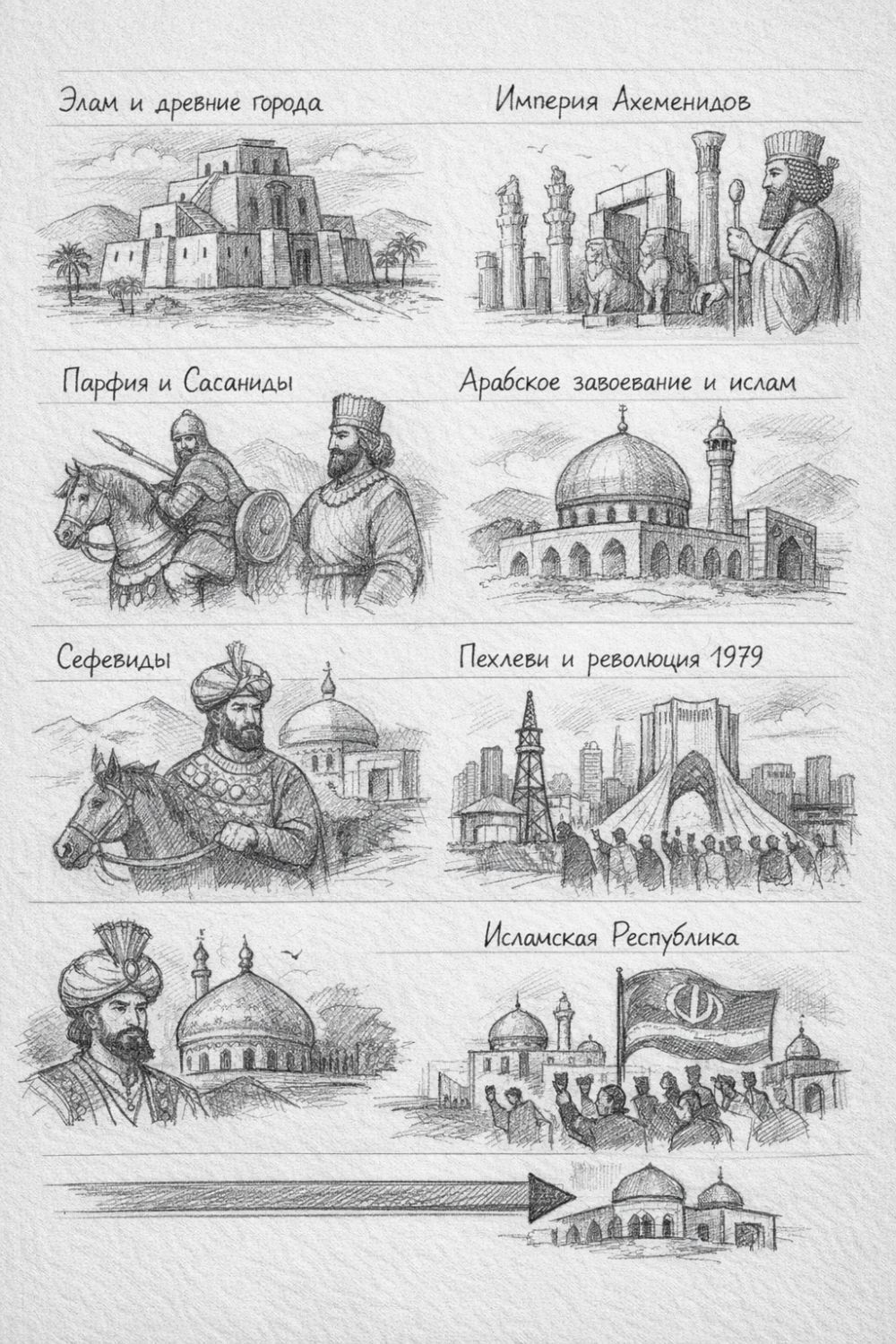 | III век до н. э. - VII век н. э. | Парфяне и Сасаниды | Укрепляются иранская государственность, религиозная и культурная рамка |