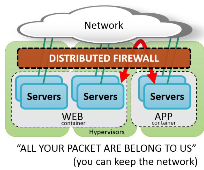 В чем суть: если «атакеру» удалось проникнуть через средства периметровой защиты в серверный сегмент он может, по сути, контролировать всю инфраструктуру. Для минимизации возможного ущерба в традиционно используют сегментацию сети при помощи дополнительных МЭ. При виртуализации всего серверного сегмента мы можем настроить свой МЭ с блэкджеком и… на каждый из серверов, тем самым дополнительно защитив сервер от возможной атаки, а также защитить всю инфраструктуру от зараженного сервера.