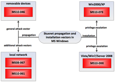 Сегодня обновили наше исследование " Stuxnet under the microscope" до версии 1.2, внесли немного косметических правок. Но самое главное добавили описание последней 0-day уязвимости, которая пока не была озвучена подробно, речь идет о повышении привилегий через Task Scheduler. В нашем отчете мы подробно рассмотрели то, как червь Stuxnet эксплуатирует эту уязвимость для повышения привилегий под Vista/Win7. Все использованные вектора для атаки червем Stuxnet выглядят следующем образом: