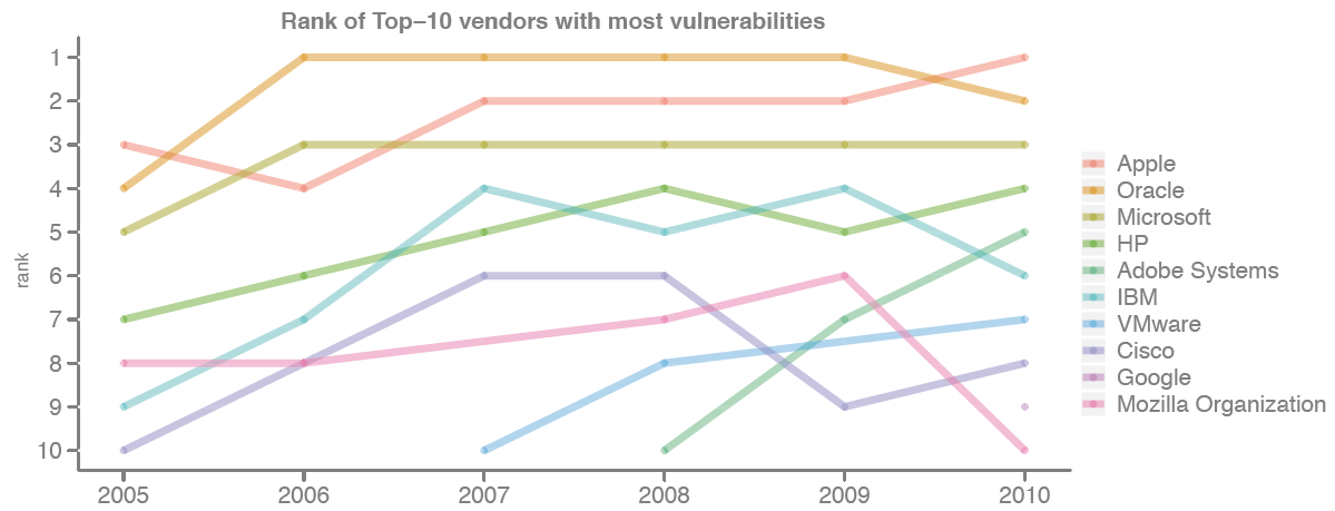 Интересный отчетобнародовала Secunia, в котором приводится срез самых крупных вендоров ПО по числу найденных уязвимостей. Интересный факт, что в этом году по числу найденных уязвимостей лидирует компания Apple, которая пришла на смену прошлогоднему лидеру Oracle. По графику можно отследить явный тренд увеличения числа найденных уязвимостей, видимо с ростом популярности эта платформа привлекает к себе все больше внимания со стороны исследователей по всему миру. Судя по графику у MS стагнация начиная с 2006 года, т.е. уязвимости находят регулярно и много. А вот Adobe, как ни странно находиться только на пятом месте.
