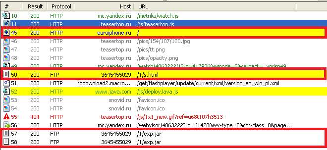 Проанализировав сетевую активность сразу бросается в глаза загрузка /1/s.hmlпо протоколу FTP, а в дальнейшем и загрузка /1/exp.jarтем же способом.