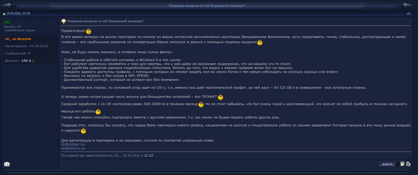 В конце весны текущего года произошло обновление семейства Win32/Sirefef и Win64/Sirefef, так же известных под именем ZeroAccess. Мы отследили появление новых модификаций в начале мая, примерно в это же время стартовала новая партнерская программа (PPI) по распространению ZeroAccess. Обновленная версия не содержит системных драйверов и скрытого хранилища для хранения файлов. Сначала разработчики в предыдущей версии избавились от драйвера для версии Win64/Sirefef, а теперь и для всего семейства целиком. Как и в предыдущих версиях для монетизации используется схема по подмене поискового трафика в популярных поисковиках. Объявление призывающая участвовать в новой партнерской программе, размещенное на закрытом форуме verified.ms, выглядит следующем образом: