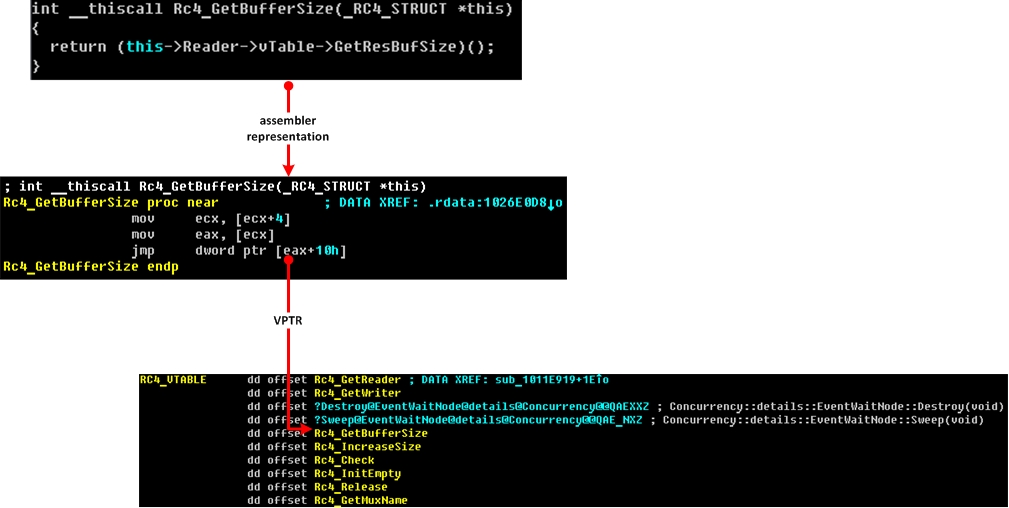 Начнем с того, что код Win32/Flamer анализировать не очень приятно, даже при отсутствии жесткой обфускации. Объектно-ориентированный код схож с тем, что уже встречалось ранее в Stuxnet и Duqu, но однозначного сходства не так уж и много. В основном схожесть кроется в стиле кодирования и архитектуре этих вредоносных программ. Если в случае Stuxnet и Duqu ООП архитектура была построена на одном фреймворке и концепциях, то у Flame есть отличия. У всех трех вредоносных программ реализована сложная логика работы, а использование ООП концепций, реализованных на C++, заставляют разбираться в работе не только самой вредоносной программы, но и компилятора тоже. В качестве наглядного примера посмотрите на реконструкцию вызова метода Rc4_GetBufferSize() в модуле mssecmgr.ocx: