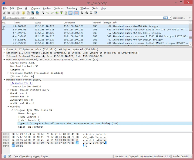 20:10:11.513755 IP 192.168.10.129.60506 > 192.168.10.128.53: Flags [P.], seq 1:28, ack 1, win 229, options [nop,nop,TS val 78657 ecr 89135], length 2737688+ ANY? irs.gov. (25)
