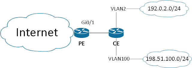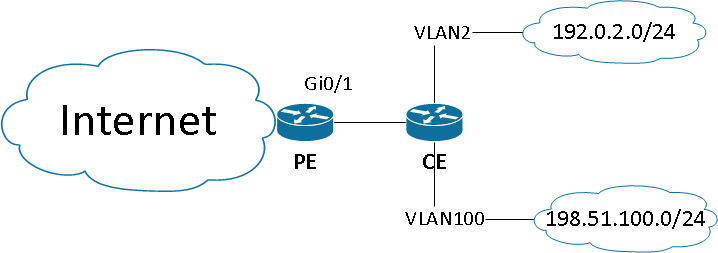 Pic. 3 shows the situation when routers' interfaces must process traffic sourced from "honest" clients 192.0.2.0/24 (VLAN2 interface on CE or/and Gi0/1 on PE) and 198.51.100.0/24 (VLAN100 interface on CE or/and Gi0/1 on PE) and discard if the source address doesn't match routing table.