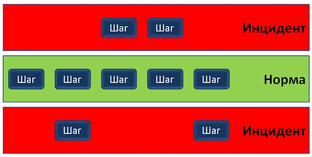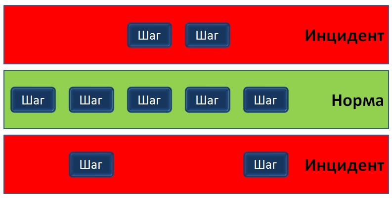 Схематически взаимосвязь нормы и отклонений изображена ниже. Есть единственный верный путь - зеленое поле. Отклонения в сторону красных полей генерируют инцидент ИБ.