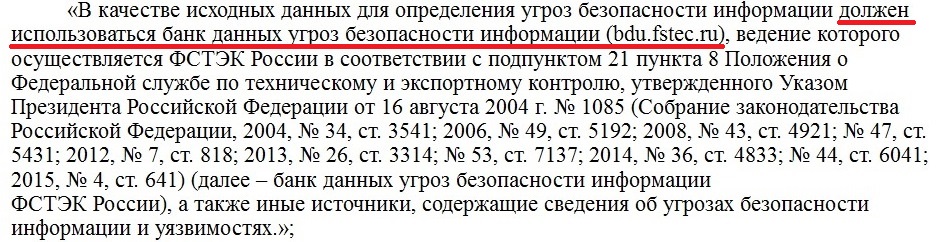 2) Теперь официально при разработке модели угроз должен использоваться банк данных угроз ФСТЭК (bdu.fstec.ru). Прощай, полюбившийся многим копи-паст из Базовой модели угроз 2008 года. Правда необходимой методики для использования банка угроз нет. Придется его адаптировать под старую методику.