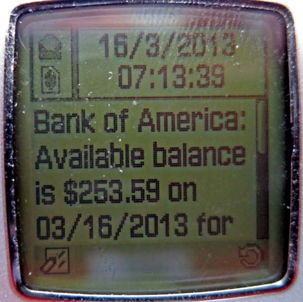 Купил как-то в Штатах местную SIM-карту. И стали с тех пор на мой номер приходить СМС-ки о состоянии текущего банковского счета прежнего владельца телефонного номера и движении средств по нему в BankofAmerica. Примерно такие.