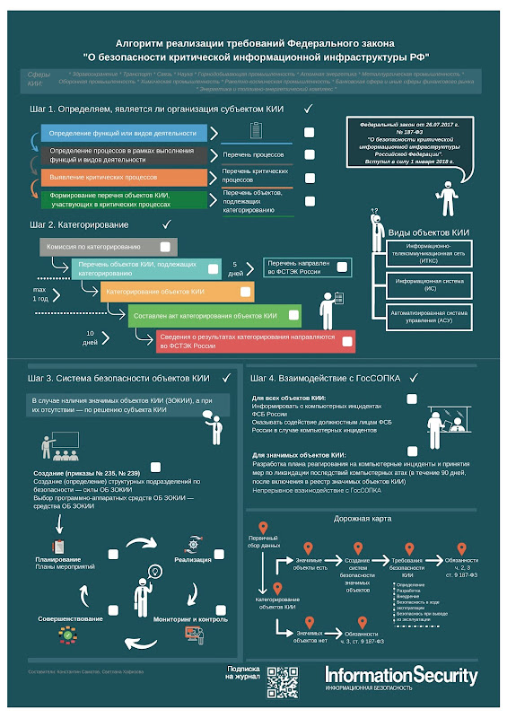 В журнале " Information Security/Информационная безопасность" №3, 2020 опубликован следующий постер с алгоритмом реализации требований Федерального закона 187-ФЗ "О безопасности критической информационной инфраструктуры РФ".