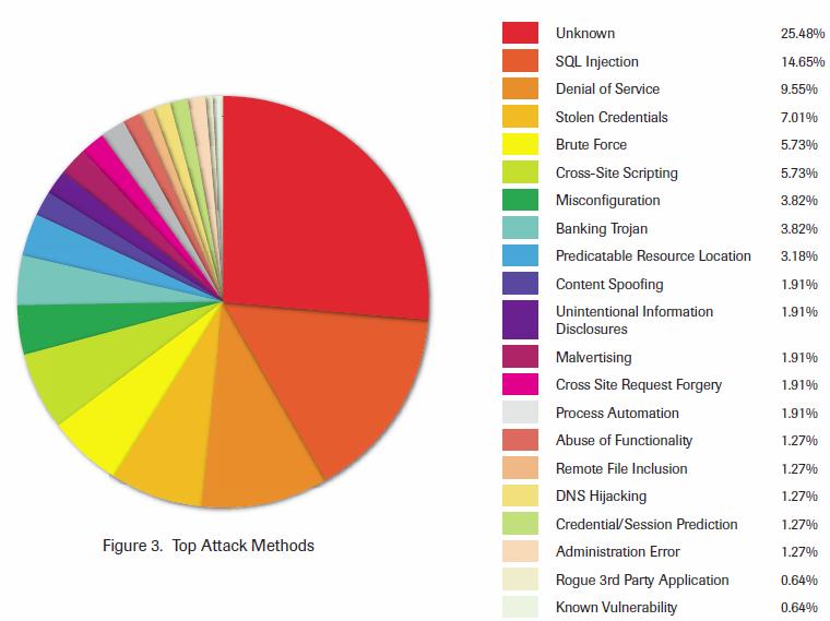 Рассматривая основные вектора атак в отношении веб-приложений, можно заметить, что SQL-инъекциии различные варианты нарушения механизмов аутентификациизаметно преобладают относительно других используемых методов атак: