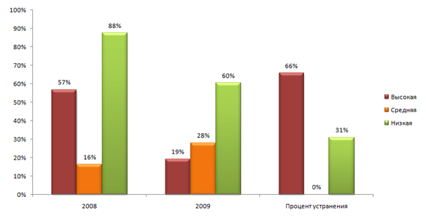 Проводя анализ устранения выявленных уязвимостей в 2009 году, по результатам сканирования в 2008 году, было выявлено, что общий процент устранения всех обнаруженных уязвимостей за год составил около 20%. В целом регулярный анализ защищенности веб-приложений и налаженный процесс устранения выявленных недостатков позволяют за год уменьшить число уязвимых сайтов в среднем втрое.