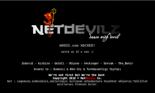 Вот такой симпатичный дефейс можно было наблюдать менее 12 часов назад при обращении к сайту whois.com :) Удар нанесла турецкая группа хакеров "NetDevilz", также известна по взломам сайтов Photobucket [ 1] и ICANN [ 2]. Официальные подробности произошедшего инцидента неизвестны в настоящее время, но учитывая "подвиги" группы "NetDevilz" в прошлом, можно предположить, что наиболее вероятный вектор атаки это угон домена whois.com.