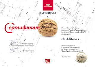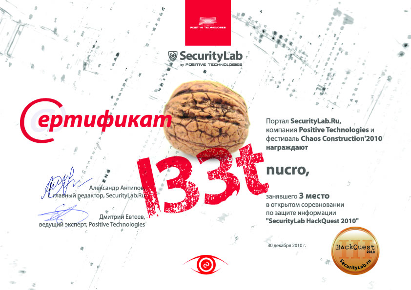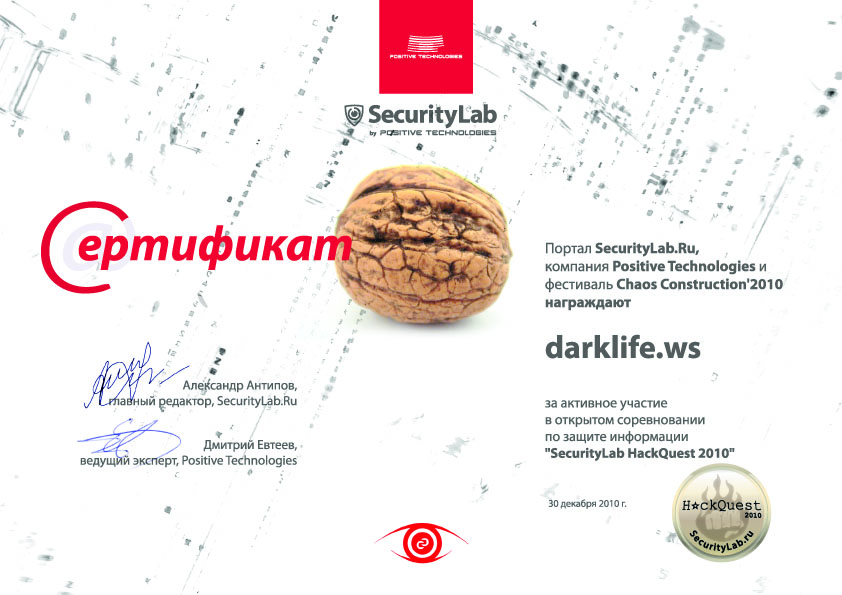 Примечание: Кому-то может показаться, что мы пропагандируем нелегальный взлом, но это не так! "Затравка" на легальность действий по оценке защищенности SecurityLab в контексте хак-квеста проскакивала, как в описании соревнования, так и во время его проведения.