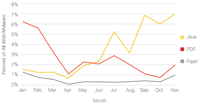 Из наиболее интересных данных, приводимых в отчете, мне показалась переориентация путей распространения вредоносного кода за счет эксплуатации уязвимостей в JAVA с июня 2010, вместо всеми любимого адобе: