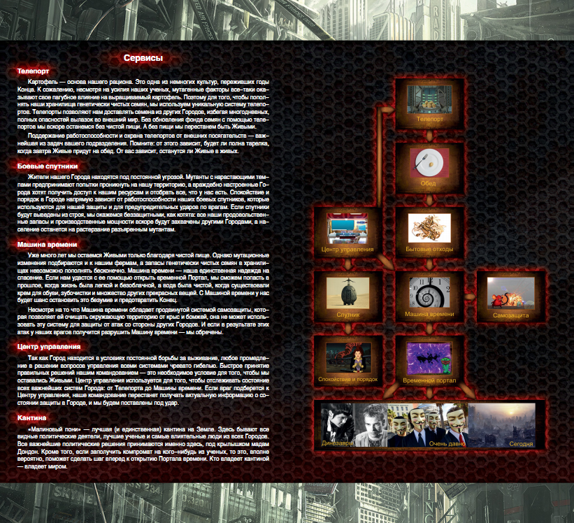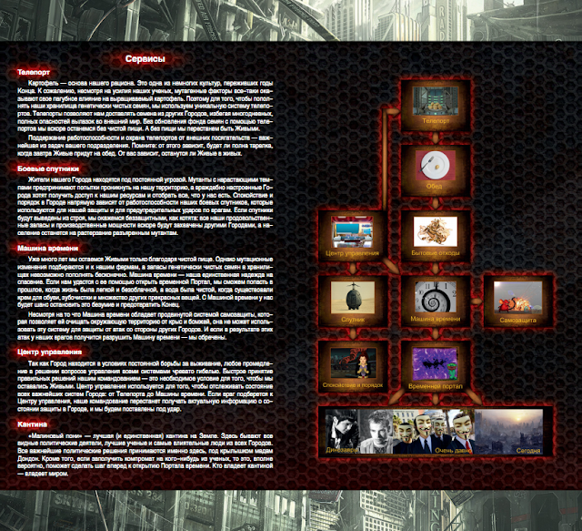 Нашим ученым удалось восстановить управление боевыми спутниками, которое было нарушено 3 месяца назад в результати атаки гигантского лысого голубя-мутанта. Теперь поддержание порядка и спокойствия в Городе будет более эффективным. Более того, мы сможем отплатить мутантам и враждебным Городам за те многочисленные жертвы, которые мы понесли за тот период, когда были лишены спутников.