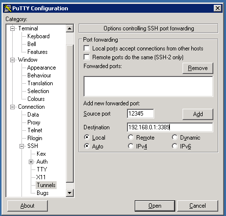 W02> socat TCP-CONNECT:2.2.2.2:12345 TCP-CONNECT:192.168.0.1:3389